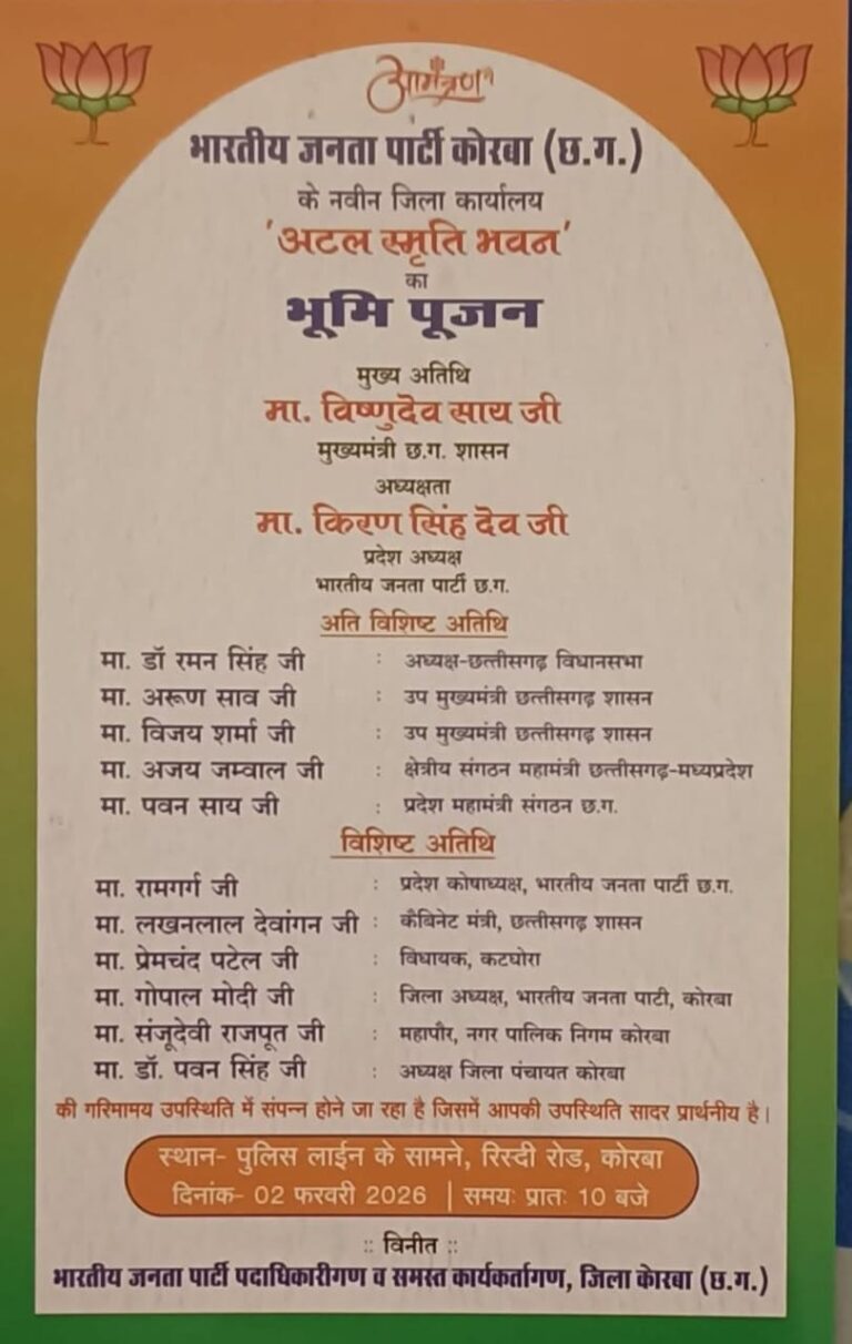 कोरबा जिला भारतीय जनता पार्टी के लिए 2 फरवरी 2026 का दिन एक महत्वपूर्ण और ऐतिहासिक अवसर के रूप में देखा जा रहा है। वर्षों की प्रतीक्षा के बाद जिला भाजपा को अपना नया कार्यालय मिलने जा रहा है, जिसे “अटल स्मृति भवन” नाम दिया गया है। ग्राम रिसदी, जिला पुलिस लाइन के सामने प्रस्तावित इस भवन का भूमि पूजन प्रदेश के मुख्यमंत्री विष्णुदेव साय के मुख्य आतिथ्य में संपन्न होगा। आयोजन को लेकर जिला संगठन तैयारियों में जुटा हुआ है और कार्यकर्ताओं में उत्साह का माहौल है।